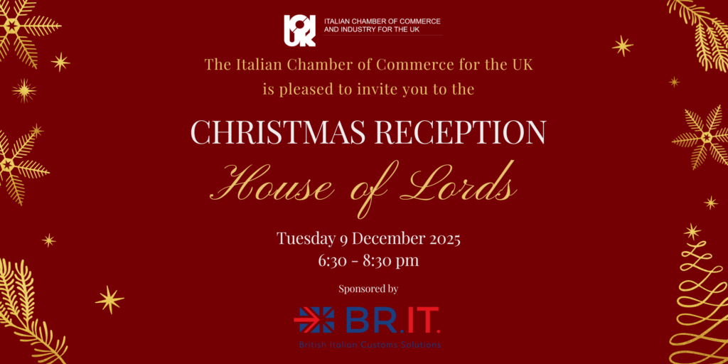 The Italian Chamber of Commerce and Industry for the United Kingdom is a company limited by guarantee. Registered in England no. 598572. Reg Office: 22-24 Ely Place, London EC1N 6TE. V.A.T. Registration No 510352988. The Chamber is recognized by the Italian Government under the law of 1st July 1970 no. 518.